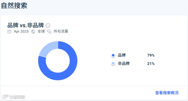 图源:Similarweb品牌搜索流量占总流量的79%,而非品牌搜索流量仅占21%,说明独立站已建立较强的品牌认知度,用户更倾向于通过品牌关键词进行搜索。