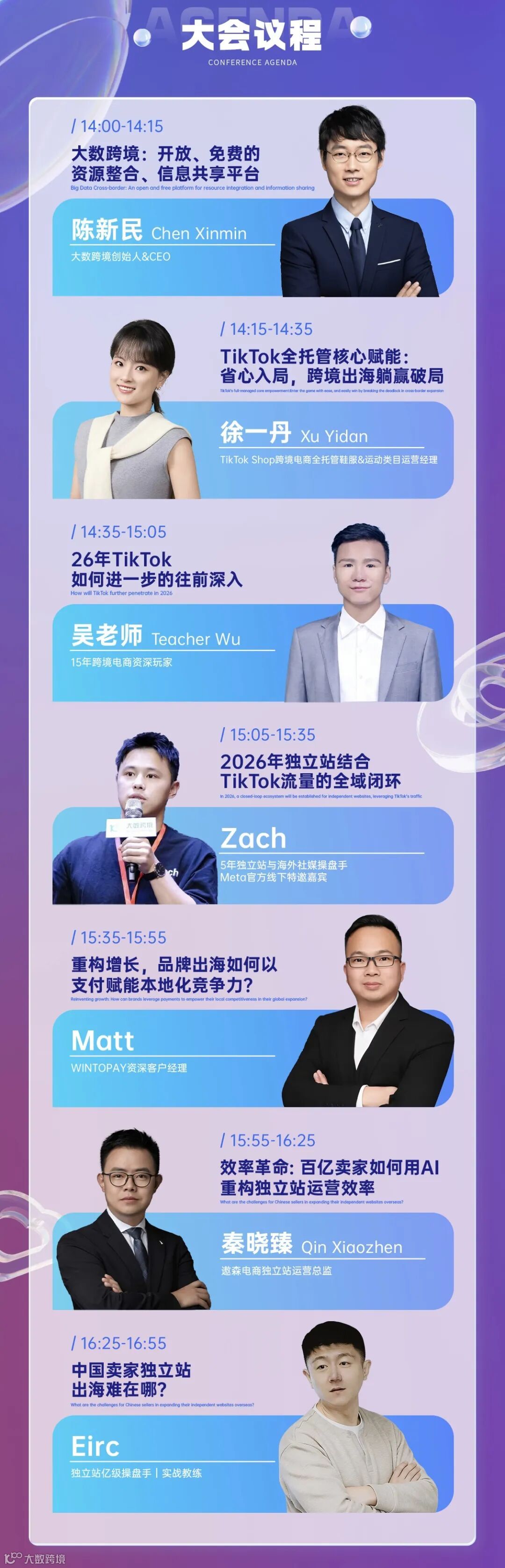 - 双平台协同实战:TikTok Shop全托管鞋服运动类目经理、独立站亿级操盘手Eric、Meta特邀嘉宾Zach等一线从业者,分享“1+1>2”的真实打法。