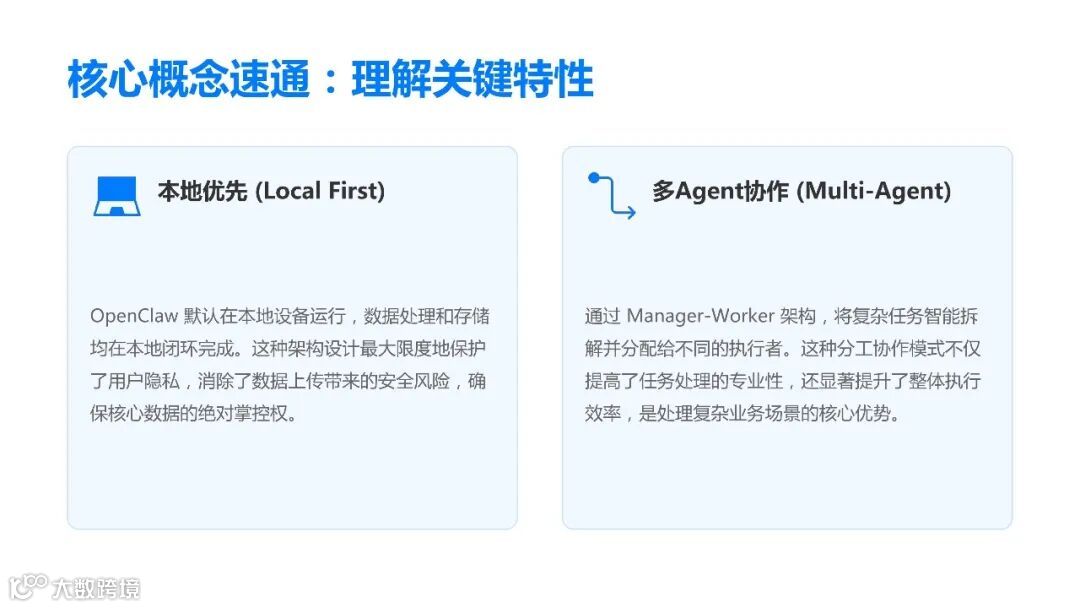 手册首先厘清 AI 智能体、执行网关等关键概念,明确“本地优先”“多 Agent 协作”等核心特性,并归纳 OpenClaw 在办公自动化、开发运维、内容创作、企业运营四大领域的典型能力。