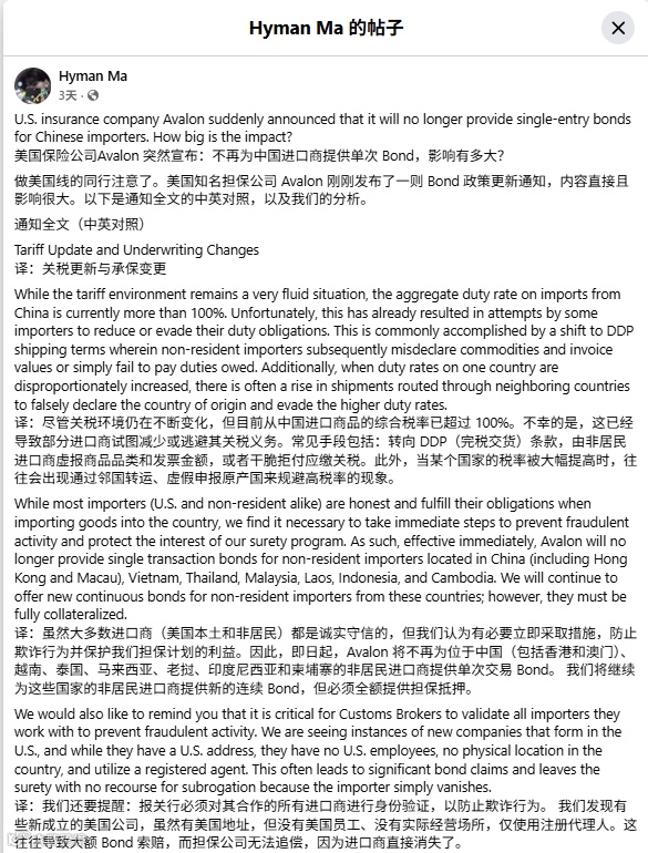 金融端“断供”形势更为严峻。美国担保公司Avalon宣布停止为中国、越南等七国“非居民进口商”提供单次Bond服务,依赖注册代理的“空壳”进口商临时清关通道被彻底关闭。若使用连续Bond,须提供全额抵押。