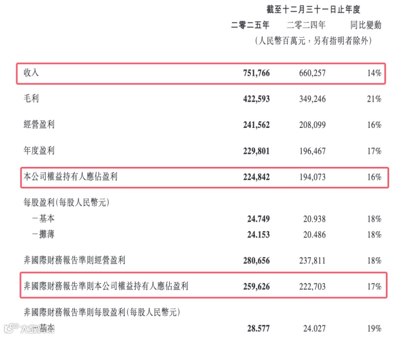 【1】3月18日,腾讯发布了2025年全年业绩报告。报告显示,2025年腾讯收入7518亿元,同比增长14%,非国际财务报告准则下该公司权益持有人应占盈利2596亿元,同比增长17%。