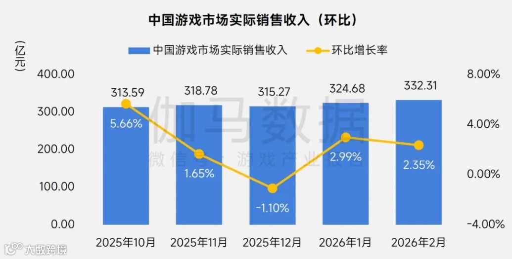 报告显示,2026年2月中国国内游戏市场实际销售收入达332.31亿元,环比增长2.35%,同比增长18.96%,同比增速创近10个月新高。整体市场在春节档催化下呈现强劲复苏态势。