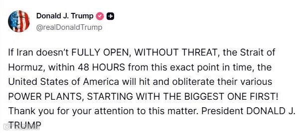 3月21日,特朗普威胁:若伊朗48小时内未完全开放海峡且消除威胁,美国将摧毁其发电厂(首攻最大设施)。
