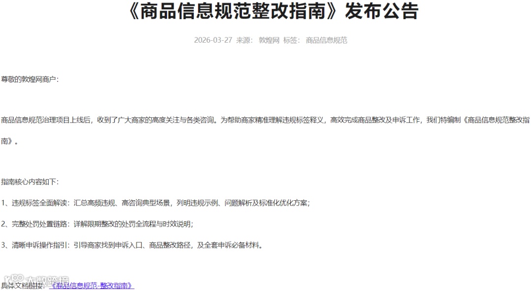 近日,敦煌网发布《商品信息规范整改指南》,帮助商家快速理解违规原因、完成整改并顺利申诉。指南包含三部分内容:一是详细解释各类违规标签,结合常见问题场景,给出具体违规例子、原因分析和优化建议;二是说明处罚流程,包括整改时限和各环节时间节点;三是提供申诉操作指引,明确申诉入口、整改路径以及所需提交的全部材料。