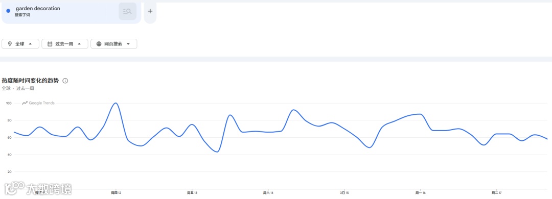 谷歌趋势显示,“garden decoration”过去一周全球搜索热度达60—100,自2月起持续飙升。其中,“small garden decoration ideas”和“garden decoration ideas homemade”相关搜索词热度上涨70%,美、英、澳等国成主要需求市场。