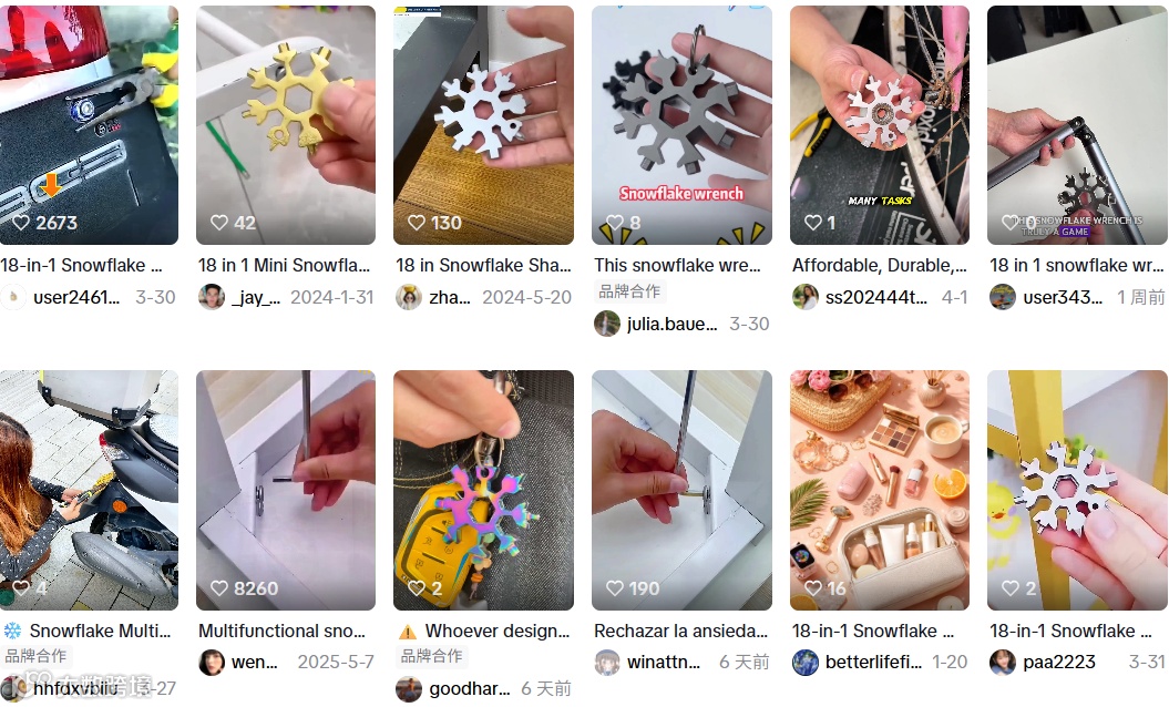 雪花扳手采用八角设计,集成螺丝刀、开瓶器等18种功能,重量仅60克。其创新性突破工具品类界限,既可作五金工具使用,又能作为时尚钥匙扣装饰。伴随全球DIY家装热潮升温,多功能工具需求显著增长。亚马逊同款售价8-15美元,月销2224单,毛利率约59%。对比国内2-15元售价,出口海外溢价达7~30倍,利润空间可观。