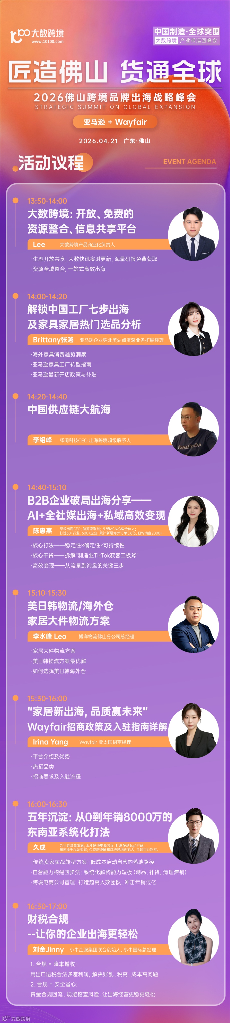 亚马逊与Wayfair官方经理将亲临佛山产业带源头,现场发布2026年平台最新政策、流量趋势与高潜力类目机会,信息一手、权威、不可替代。