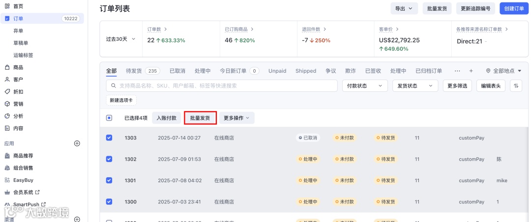 商家可以在后台设置合适的物流服务商和偏好,然后在订单列表单个/批量「创建发货标签」,系统将自动填充相关信息。完成物流账单支付后,在运输标签页中,商家就可以清晰看到每笔订单的发货履约状态,并对订单进行「批量作废/打印」等操作进行管理。