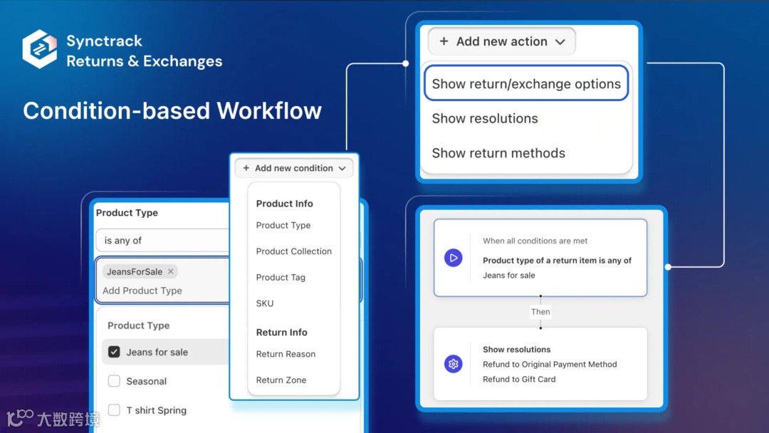 同时,定制化的退换服务,让顾客选择更灵活。Synctrack支持通过商店积分、礼品卡或折扣码等多种灵活的方式进行自动退款,以最大化挽留订单利润,灵活适配不同业务场景。顾客也可以自由决定如何处理退货、接受通知,提升了消费者的参与度和满意度。