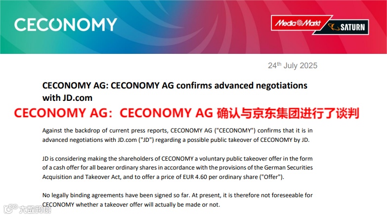 该战略迅速落地:京东以约185亿元人民币收购欧洲消费电子零售巨头Ceconomy控股权。后者拥有超4300万全球会员、5万余名员工、1000多家线下门店,为京东打通欧洲核心零售网络奠定坚实基础。