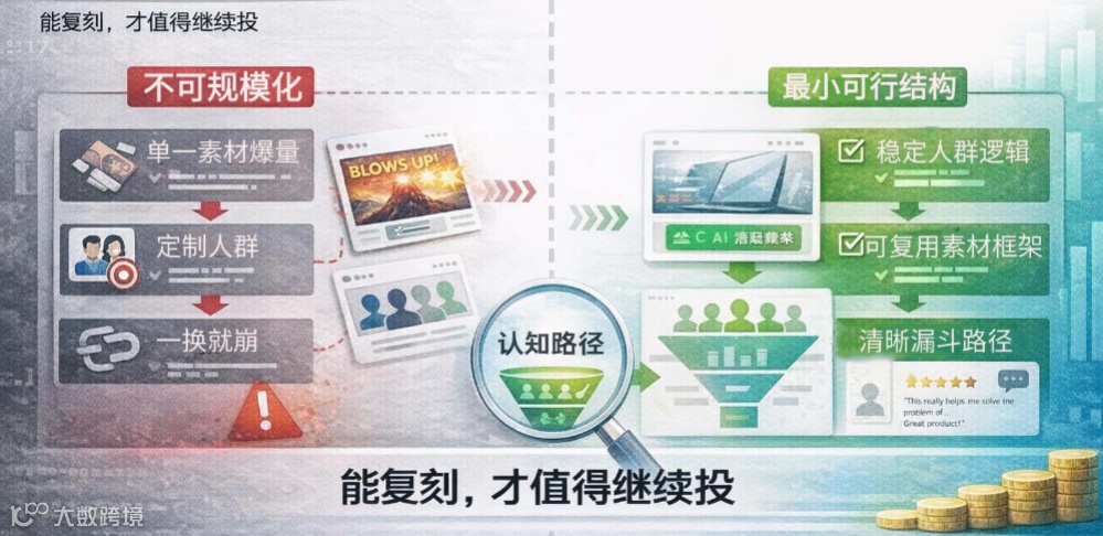 0–1 阶段的关键是跑通最小可行结构:具备稳定人群逻辑、可复用的素材框架、清晰转化漏斗。即使效率不高,只要可复制,才具备规模化投入的基础。