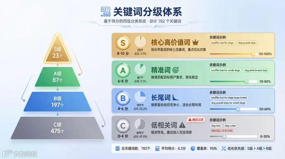 782条原始词 → 筛选出307个精准关键词,按S/A/B/C四级分类,每个词都有相关性、流量、竞争度、转化率四维评分。