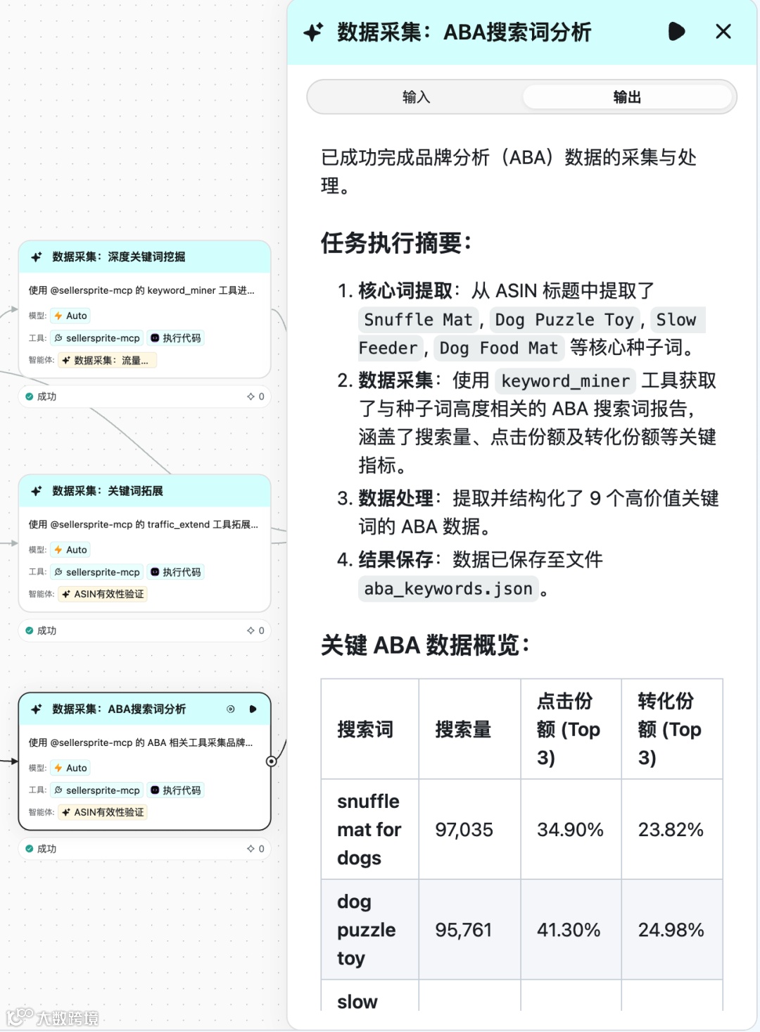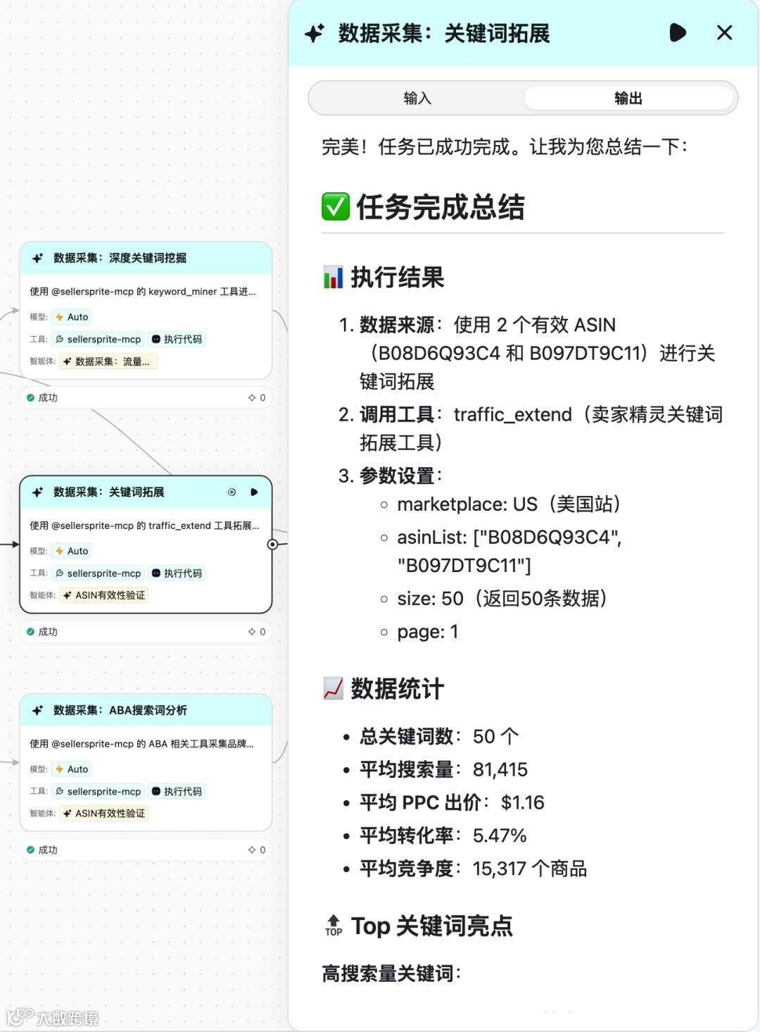 四个节点并行执行,各自调用卖家精灵 MCP 的不同能力: