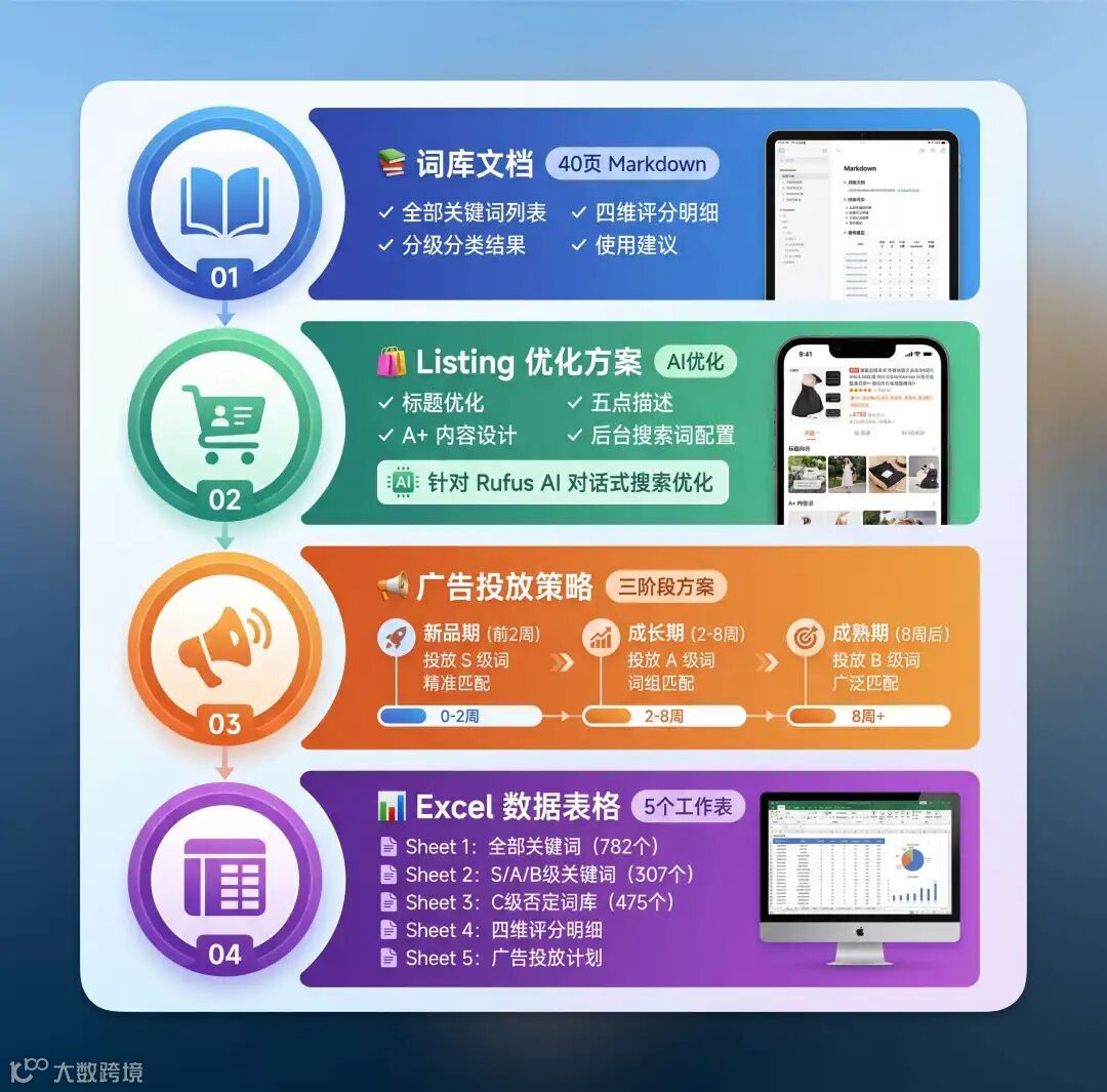最终交付:40页关键词词库文档 + Listing优化方案(适配Rufus对话式搜索)+ 三阶段广告投放策略 + 5个工作表的Excel数据表。