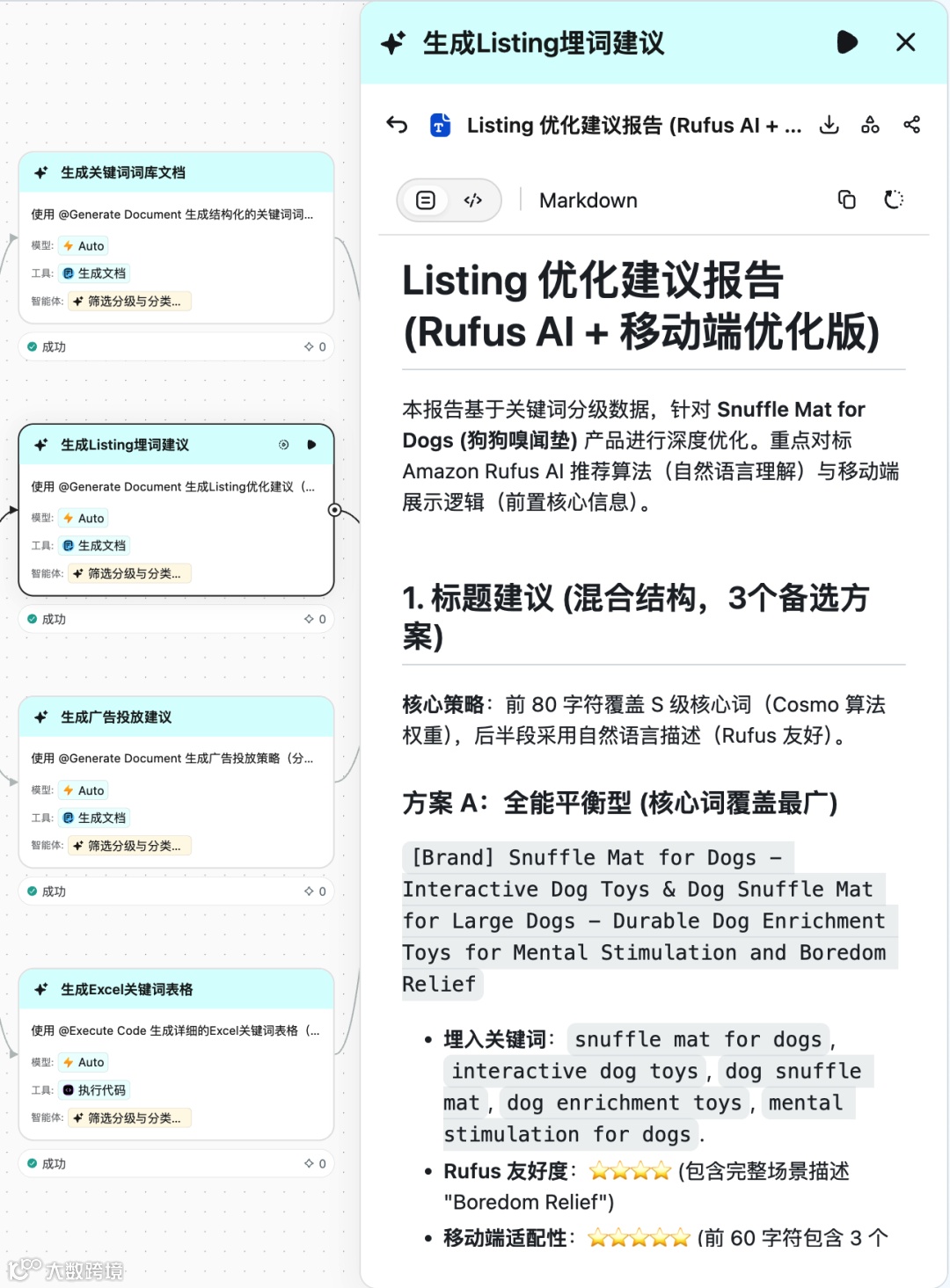 运营需要的是结构化的 Excel、多维度的分析报告、能直接用的 Listing 方案。