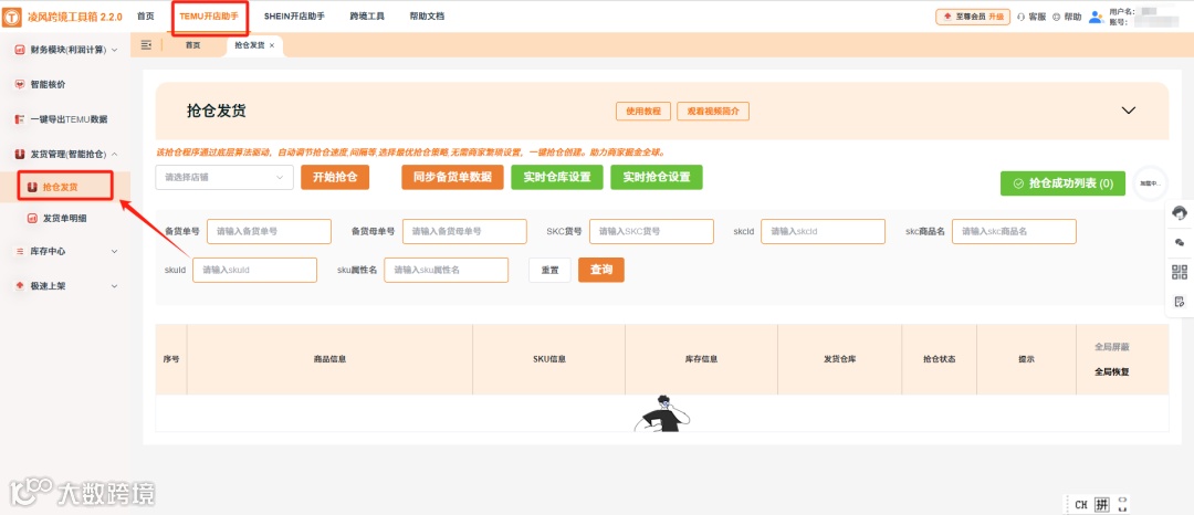 1.前往凌风跨境工具箱插件左侧【发货管理】-【抢仓发货】